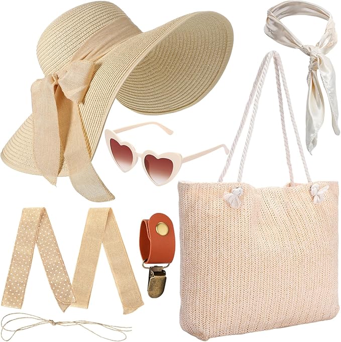 5 Pcs Women Straw Beach Hat Set with Straw Beach Tote Bag Summer Sunglasses Women Head Scarf Hat Clip for Travel Beige