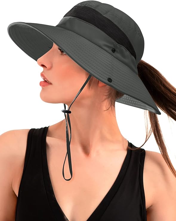 Sun Hat with Ponytail Hole for Women,UPF 50+ UV Protection Wide Brim Safari Hking Waterproof Foldable Beach Bucket Hat